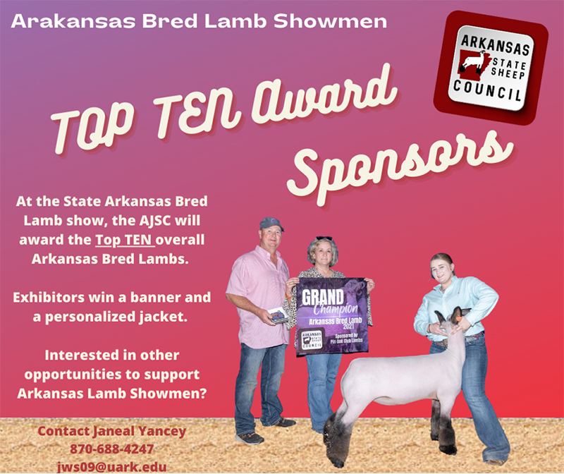 Without the help of our gracious State Fair sponsors our Arkansas Bred Lamb Program would not be possible. Next time you see a representative from any of these farms, companies, or organizations, please extend a big thank you!